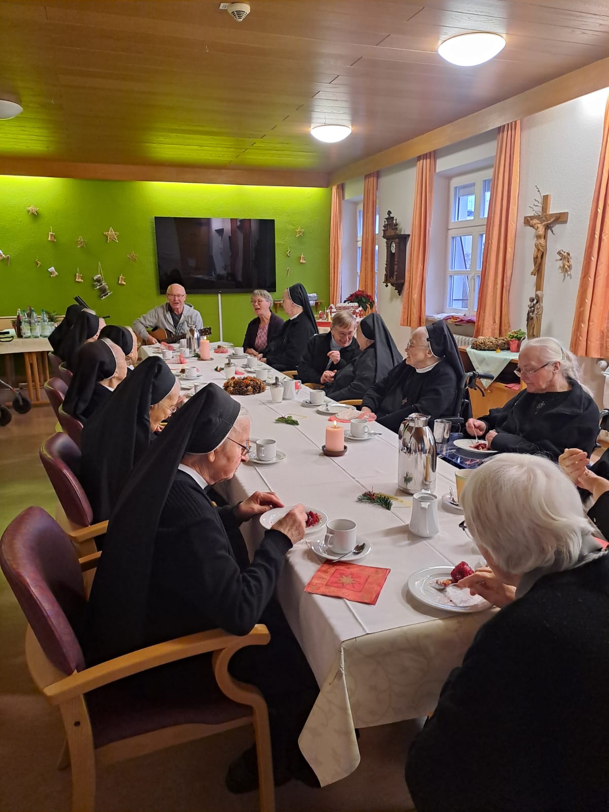 Die Ritaschwester Gertrudis Seemann hatte ihre beiden leiblichen Schwestern Maria und Notburga zu Besuch und lud ihre Mitschwestern zu Kaffee und Kuchen ein. An der adventlich geschmückten Kaffeetafel kam es
