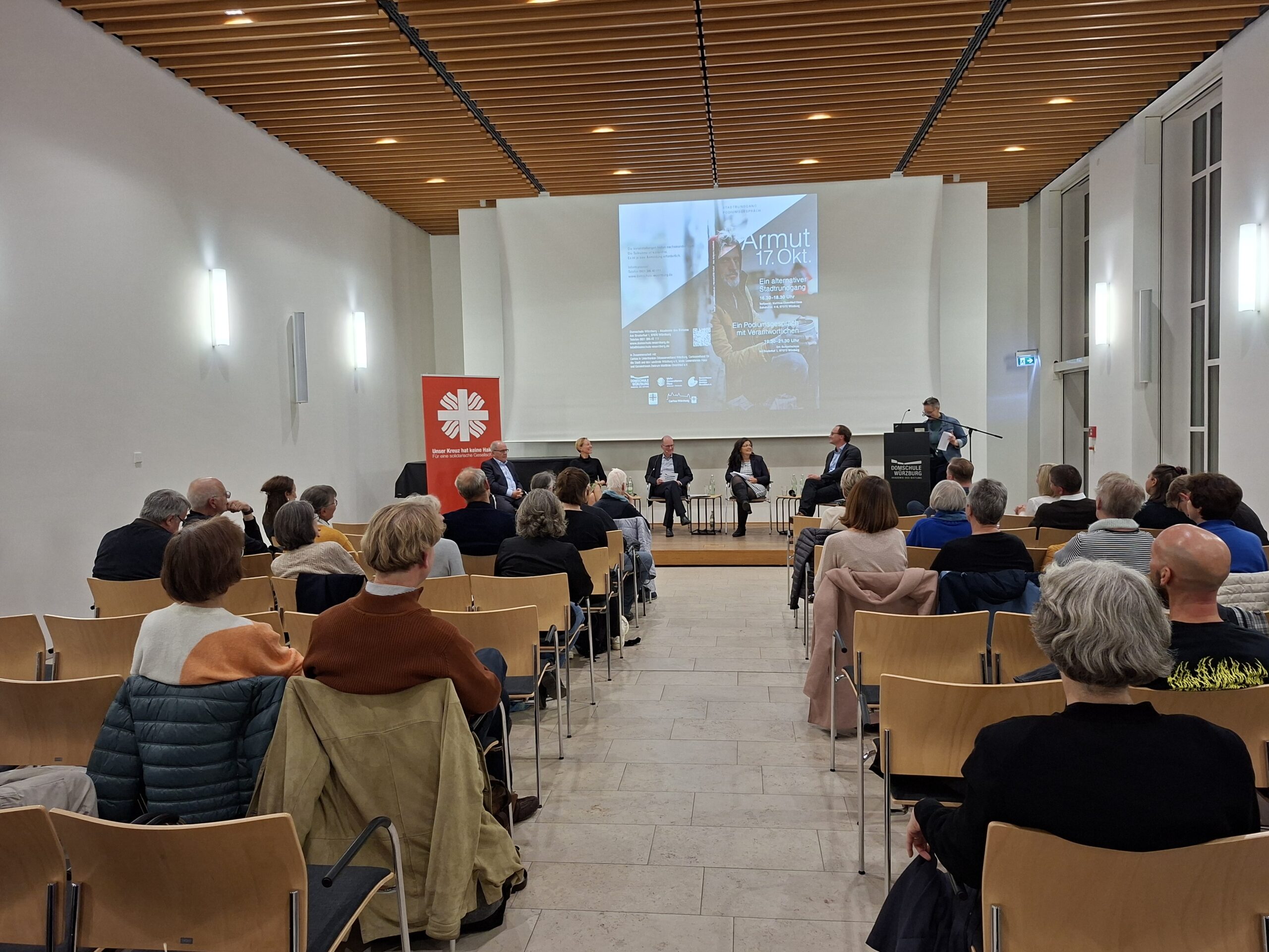 Würzburg, 17.10.2025. Zum internationalen Tag zur Beseitigung der Armut luden Akademie Domschule, die Caritas und das Mehrgenerationenhaus Matthias Ehrenfried im Anschluss an einen alternativen Stadtrundgang zur hochkarätigen Podiumsdiskussion ins Burkardushaus